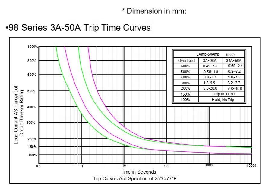 98 Series is 3-50 amps, Suitable for European-Power strip, uninterruptible power system(UPS), inverter, water pump, mobility scooter, machine tool, Generator, battery protection, motor protection etc.