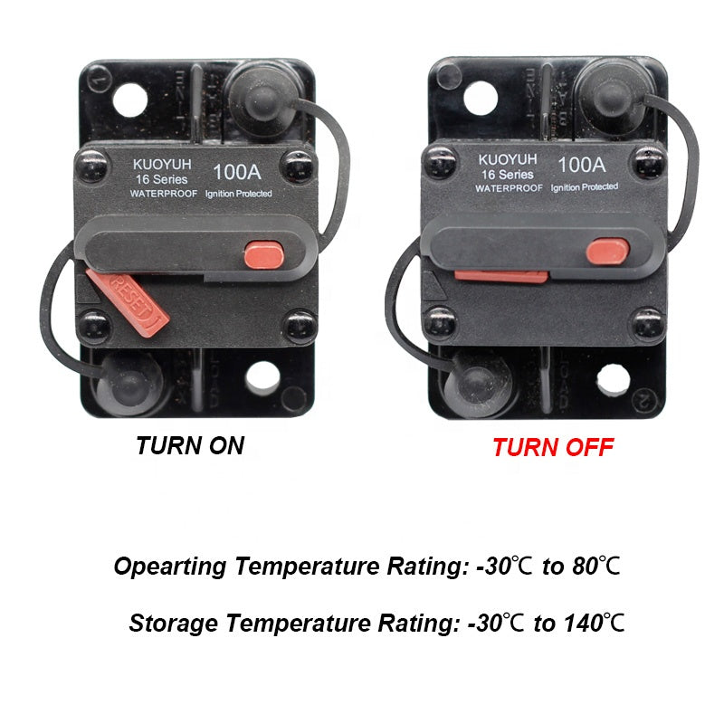 16F series waterproof circuit breakers have a current of 30A-300A, suitable for marine, RV Cars, truck tailboards, ATVs, winches, electric anchors, battery protection, vehicle-mounted inverters, etc.