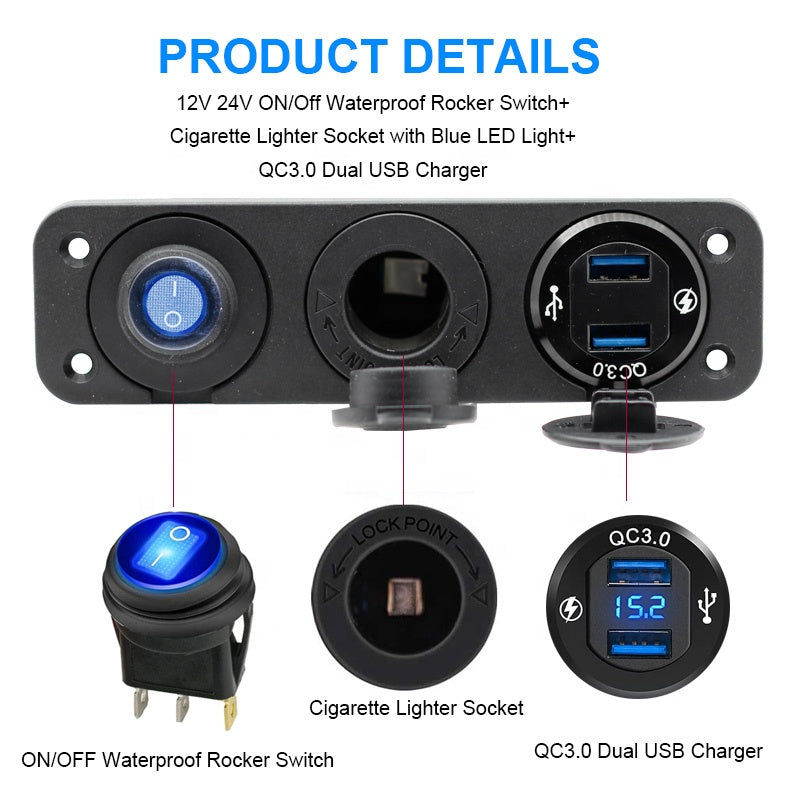 Aluminum QC 3.0 Dual USB Ports with LED Voltmeter 12V Power Socket Outlet for Car Boat Marine RV Switch Panel Material: ABS , aluminum plate; Working voltage: dcl2v-24v; Dual USB charger: DC 5V / 4.8A; Power socket: DC 12V; Display range of voltmeter: DC 0-24V; Toggle switch: DC 12V , 20A