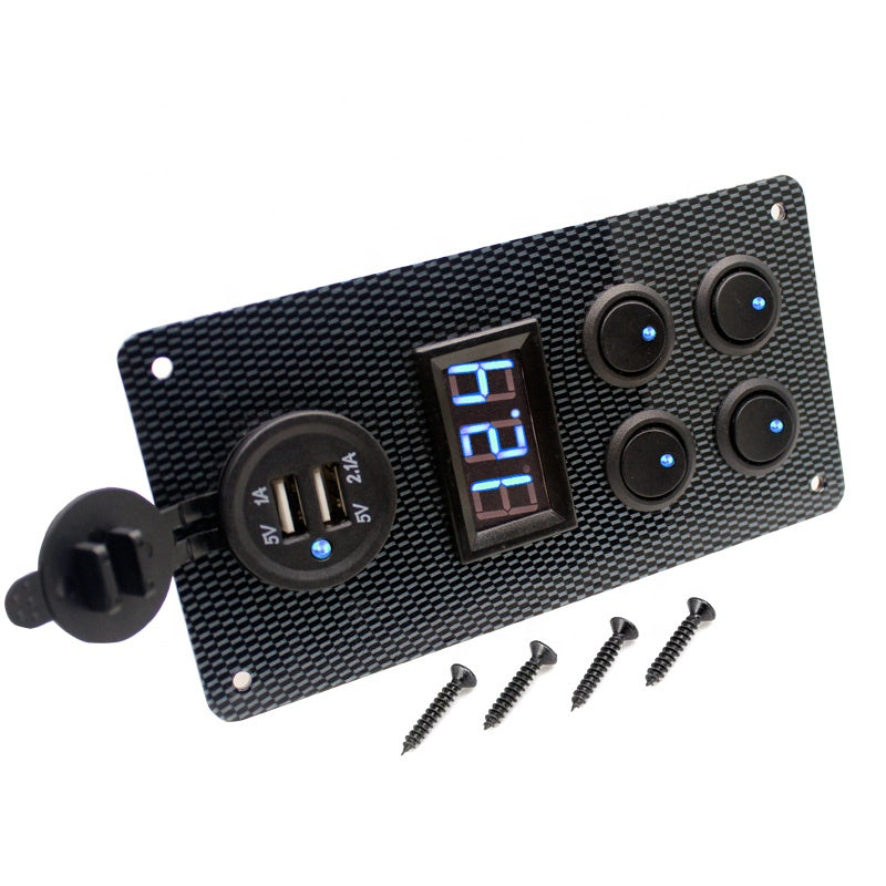 4 Gang Rocker Dual USB Charger + Digital Volmeter +12V Outlet Pre-Wired Switch Panel Application scenarios: RV, car, yacht, ship, truck, etc. Color: Black; Panel material: water transfer printing aluminum plate; Switch: on / off; Switch LED: blue, red, black (optional); Optional: LED voltmeter (white, green, blue and red); Installation: pre wiring; USB interface: 2 USB (5V 1A / 5V 2.1a)