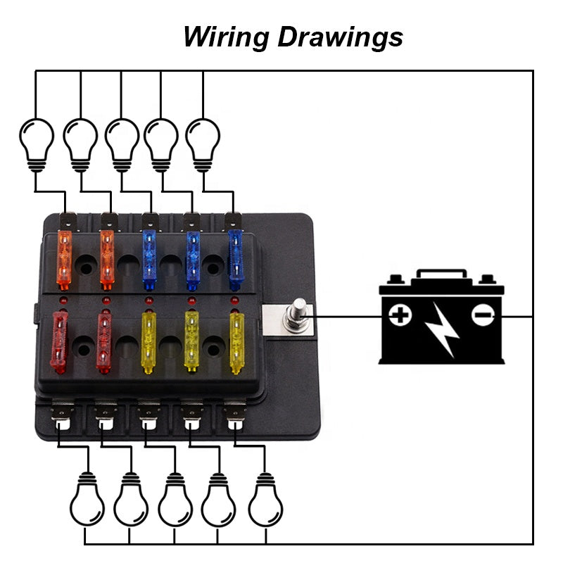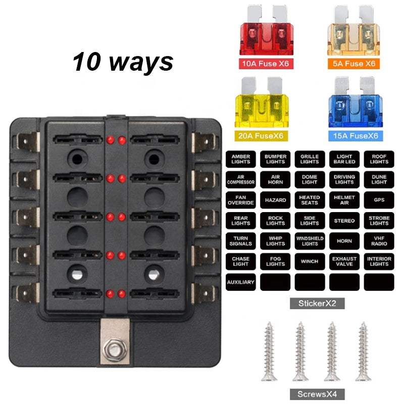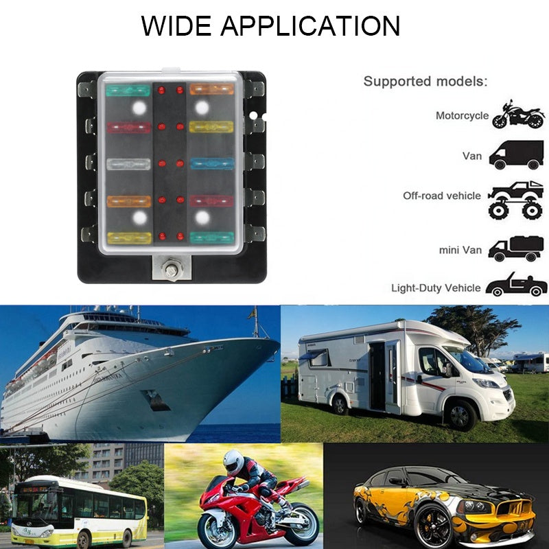 12V 24V 10 Way Car Boat Marine Trike Blade Fuse Box Holder with LED Warning Light
